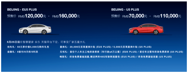 Any vehicle ordering by BAIC APP till May 25th 2021 is entitled to rich preferential policies, including RMB5000 purchase allowance at cost of RMB50; financial loans without down payment, mortgage and interests; subsidies of RMB20,000 for EU5 PLUS and RMB5000 for U5 PLUS at most; lifecycle free quality guarantee for the whole vehicle and lifecycle free basic traffic. More jackpots will also be expected by BAIC APP, JD.com and Tmall.com, such as surprising discount by 5.5 for 5 EU5 PLUS and 5 U5 PLUS (up to RMB50,000 per unit) and the unique owner certificate signed by Li Xueqin.