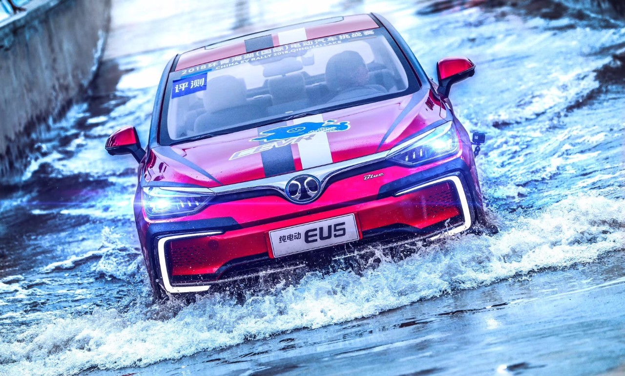 (北汽新能源參賽車輛進行涉水評測)