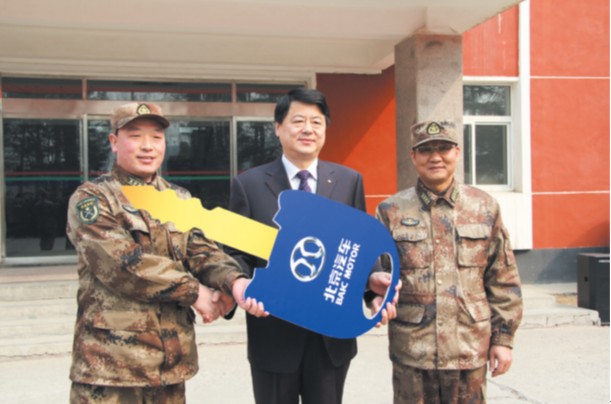 北京股份公司3月26日向駐守在順義的北京衛戍區66168 部隊贈送6輛“勇士”軍車儀式在66168部隊舉行。北汽股份總裁韓永貴、北京分公司領導參加了交車儀式。